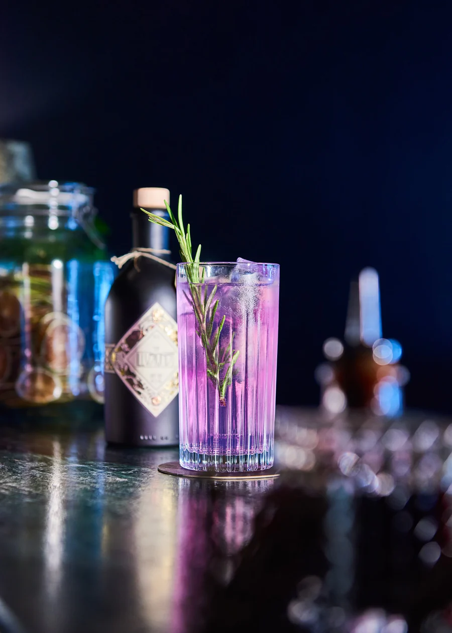 Zutaten: 5cl Illusionist Masquerade | 15cl Tonic Water (z.B. Fevertree Indian) | Zitronenzeste und Rosmarinzweig als Garnitur