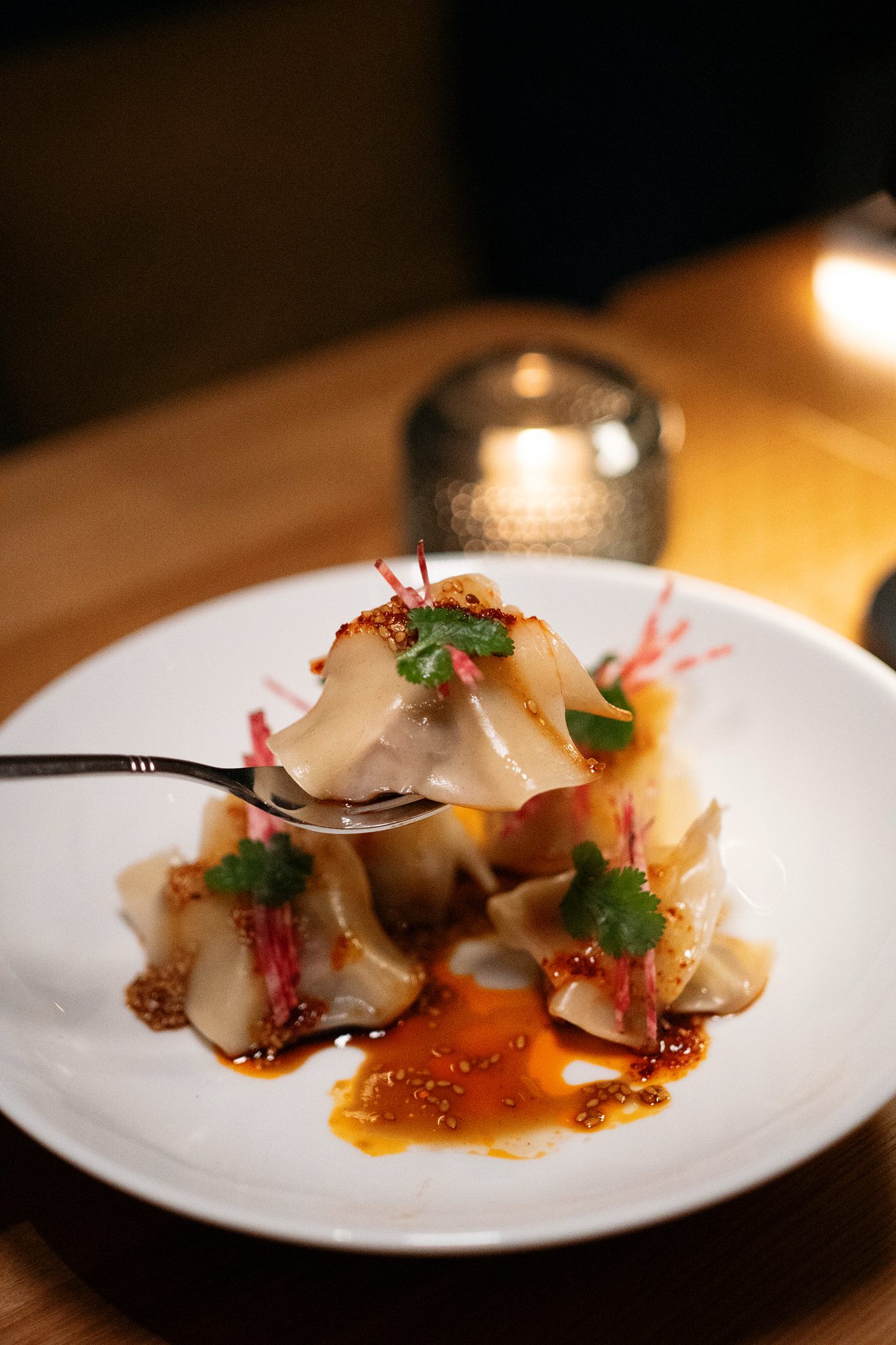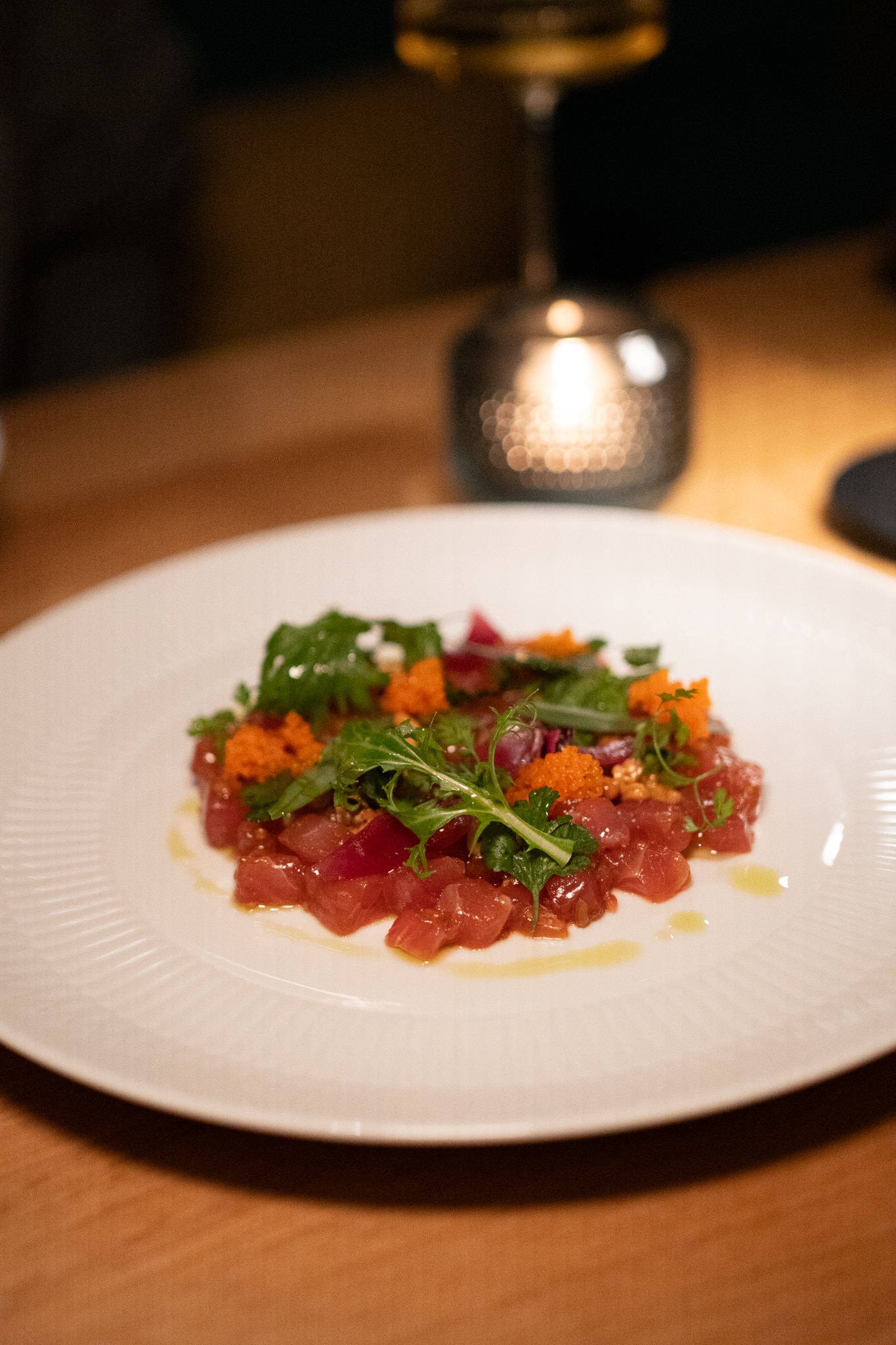 So und nun zum Abendessen. Probiert als Vorspeise unbedingt das Bluefin Thunfisch Tatar mit Lachskaviar in unglaublicher Sashimi Qualität sowie die hausgemachten Dumplings (gefüllt mit Schweinefleisch & Garnelen) mit Sesamsoße & Koriander. Auch der handgeschnittenen Pata Negra sowie die irischen Felsennestern (Nr. 2) sind perfekt, um in den Abend zu starten. Die Karte wechselt saisonal, derzeit stehen neben dem Bluefin Thunfischsteak mit frischem Marktgemüse, auch gegrillter Ziegenkäse mit Radicchio, Fenchel und Grapefruit als Hauptgerichte auf der Karte.